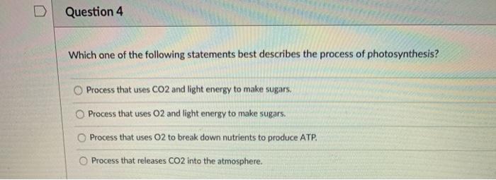 The foundation of most food chains. Which of the following statements best describes the process of photosynthesis. The reactants of photosynthesis are the products of cellular respiration.
